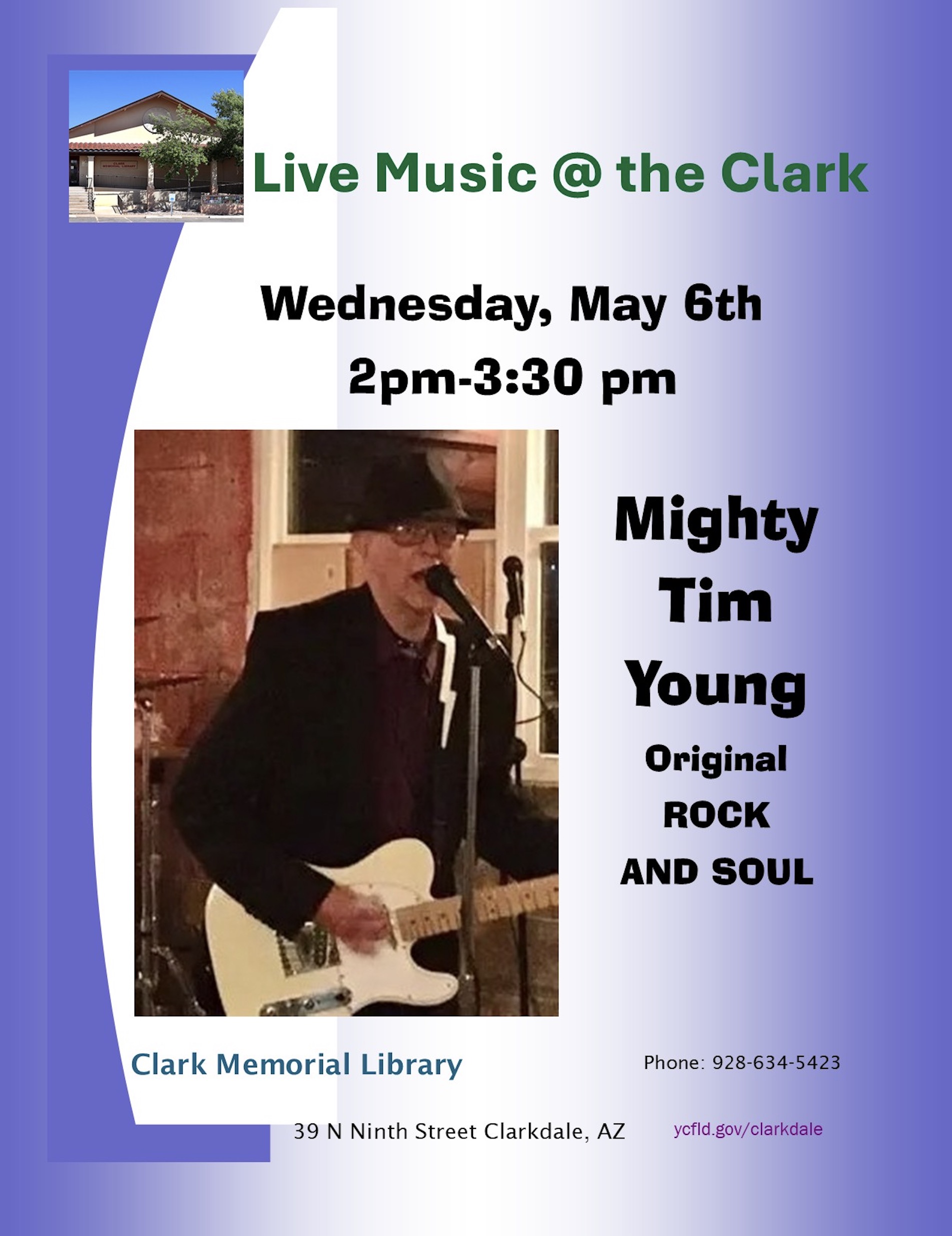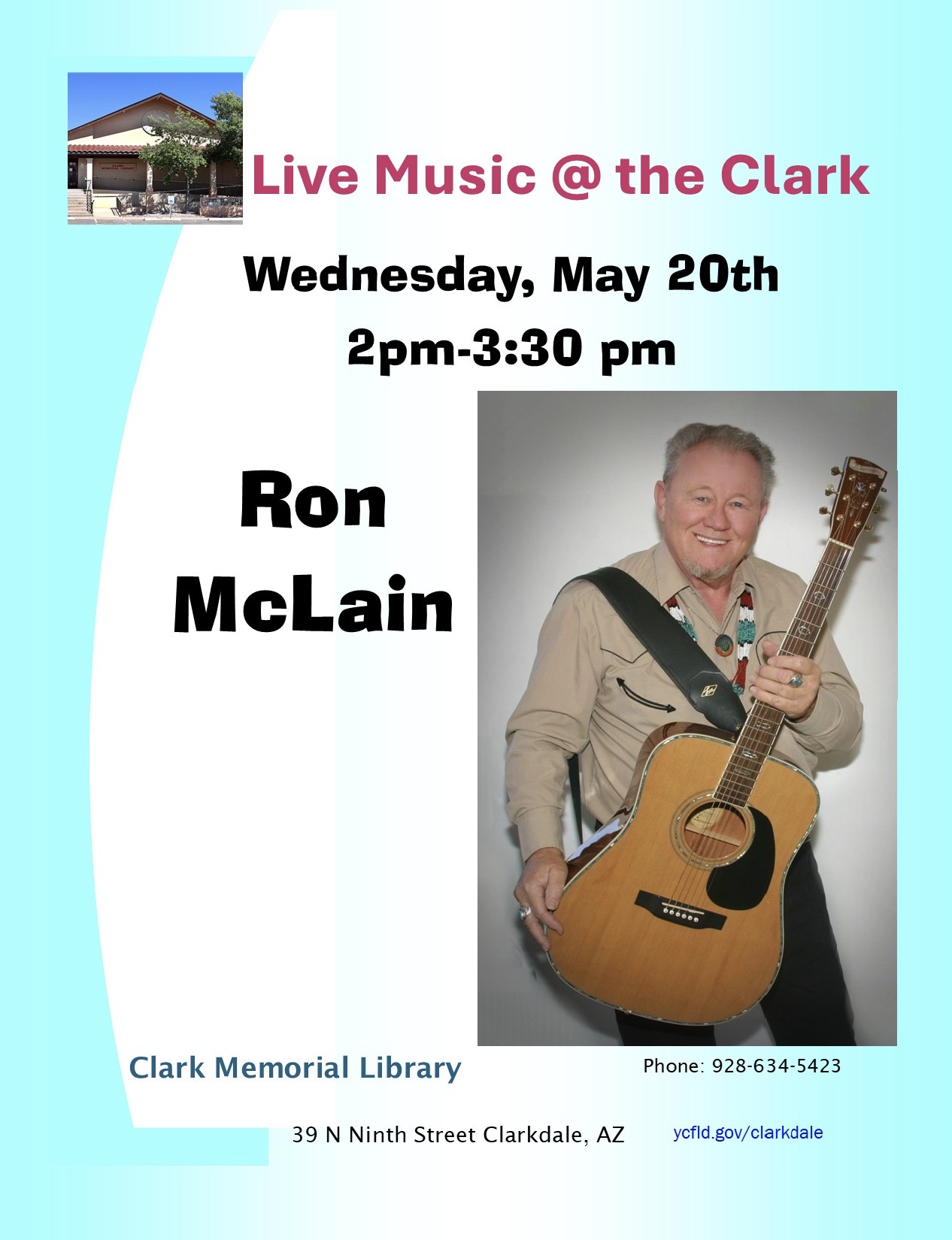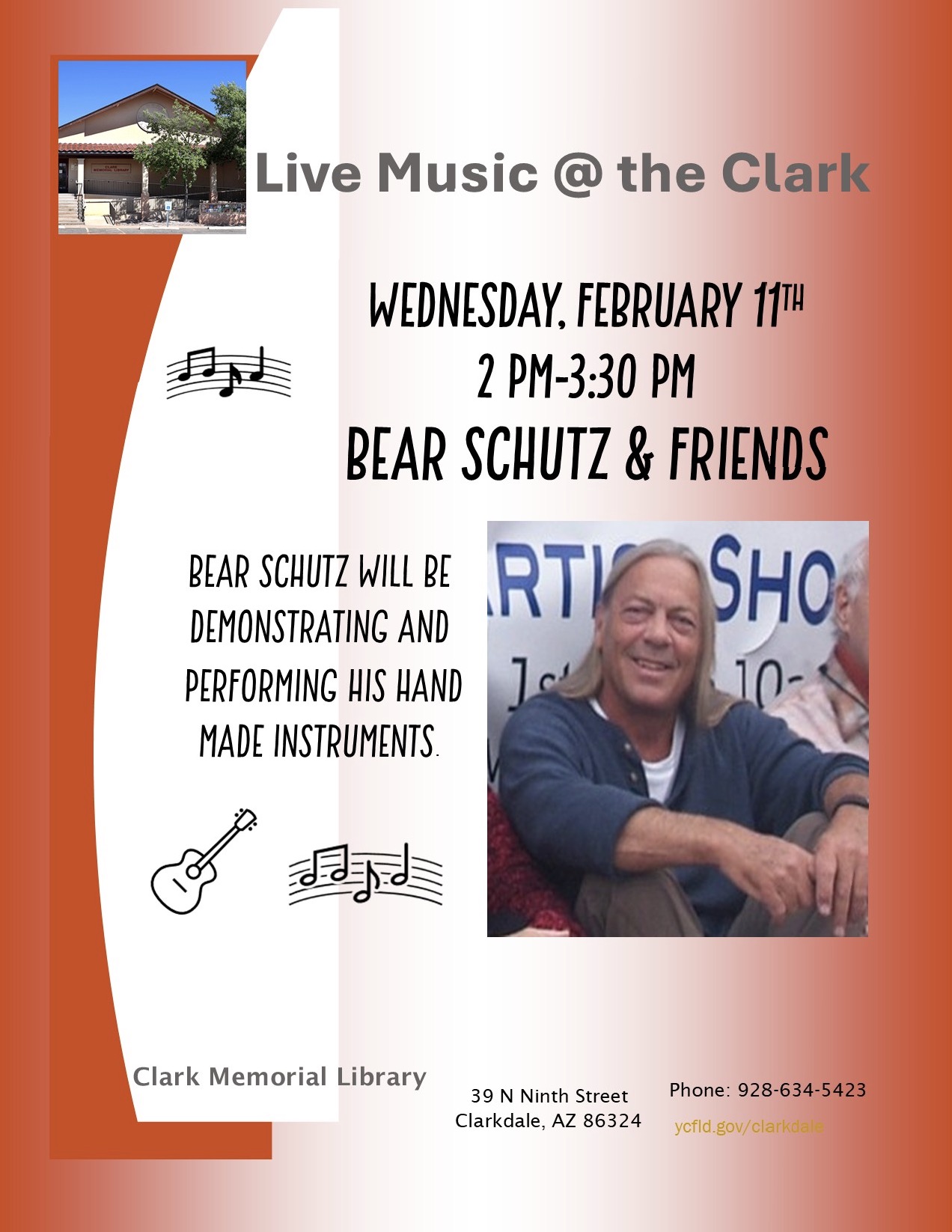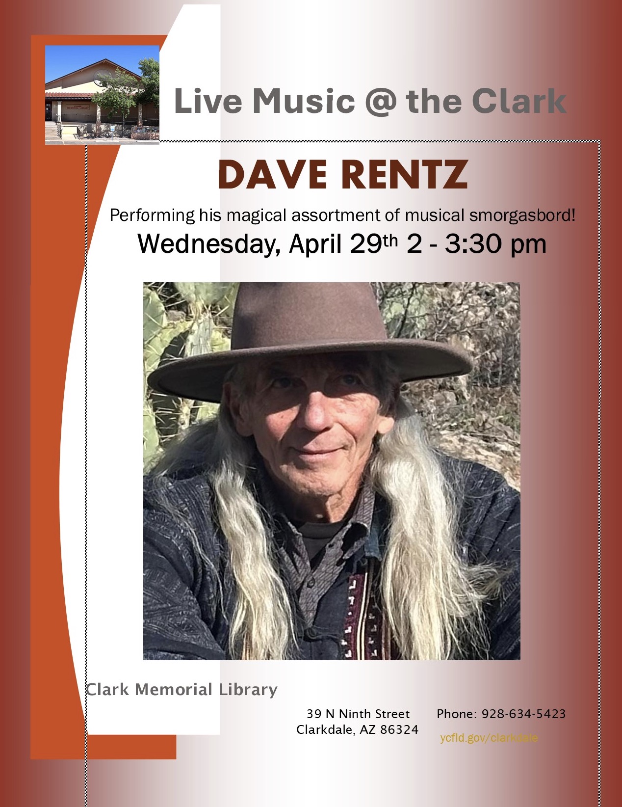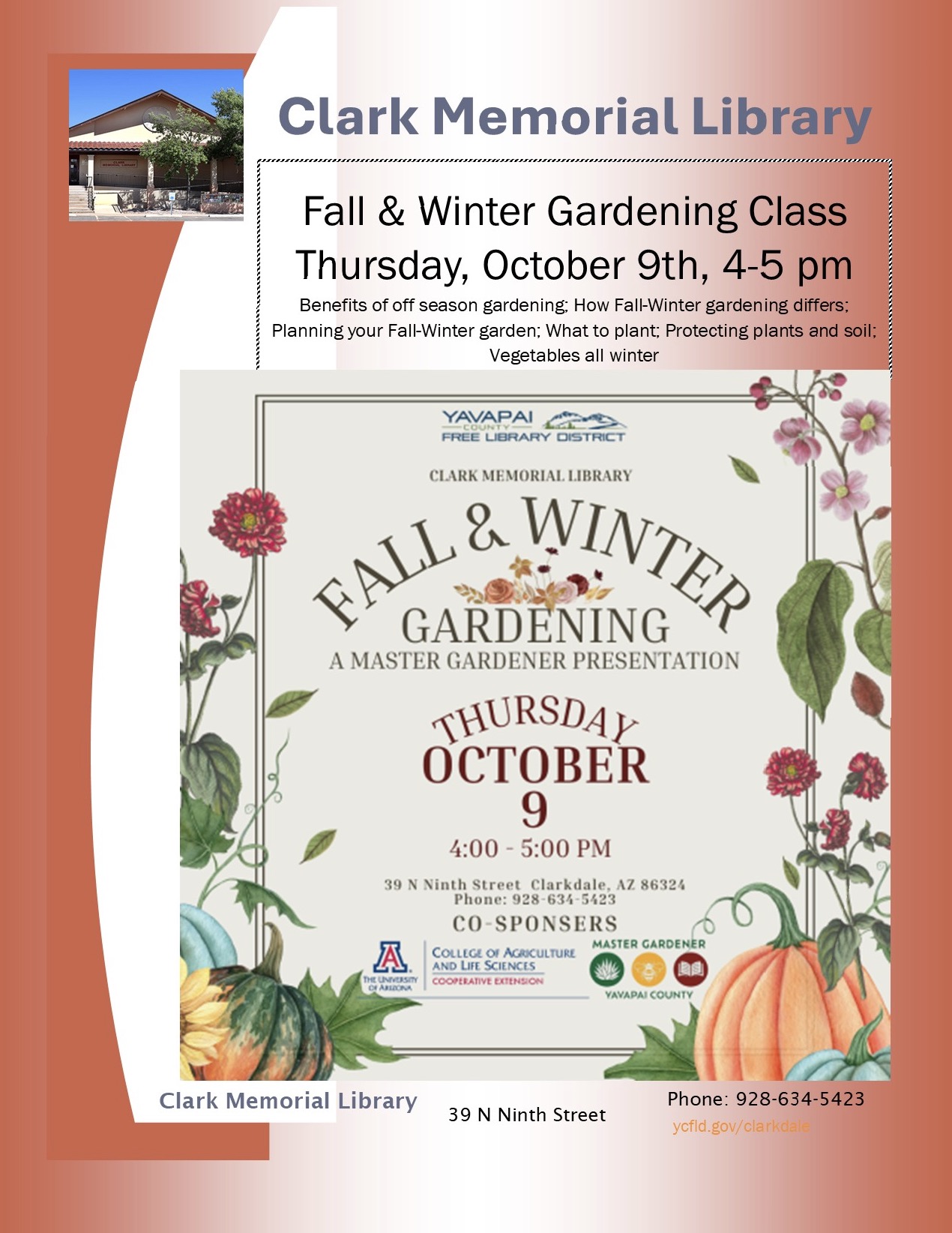 Clark Memorial Library is again hosting Author talks, classes and workshops. As these events are scheduled the dates and times will be posted on this website as well as on Clark Memorial Library’s calendar which can be accessed at http://www.ycfld.org/clarkdale